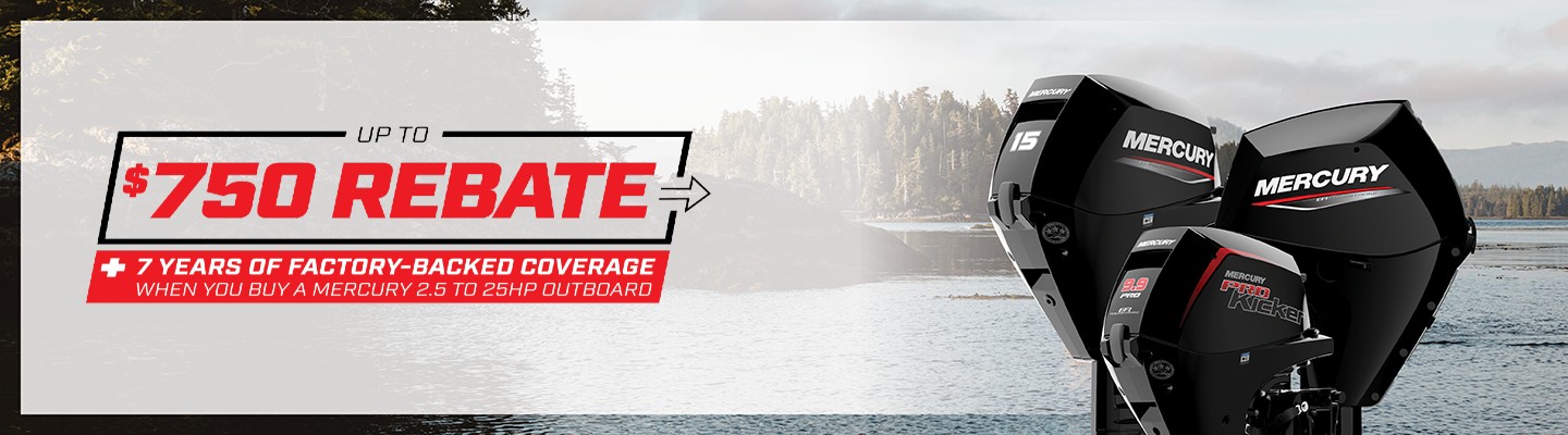 2.5 – 25hp tiller outboard engines will be eligible for a retail factory rebate of up to $750 and 7 years total coverage. All portable retail sales must be completed between April 15, 2024, and May 31, 2024. Registration and consumer factory rebate must be submitted by June 15, 2024. This consumer factory rebate is on qualifying portable models sold direct to dealers from Mercury. All Avator / Electric, Mercury Racing, Diesel, CPO, government, donations, as well as engines sold for commercial, camp or resort applications, guide and outfitter registrations. Sales/registrations outside the United States are excluded. Also excludes any non-U.S. resident or address outside of the U.S. Units must be manufactured in current calendar year or 4 immediately preceding calendar years. Excludes sales from non-authorized dealers. Backorders do not qualify. Engines originally sold to a Boatbuilder are also excluded. Engines on the Angling or Sponsorship program do not qualify. Units eligible are limited to available new stock in dealer inventory. OFFER VOID WHERE RESTRICTED OR OTHERWISE PROHIBITED BY LAW.
